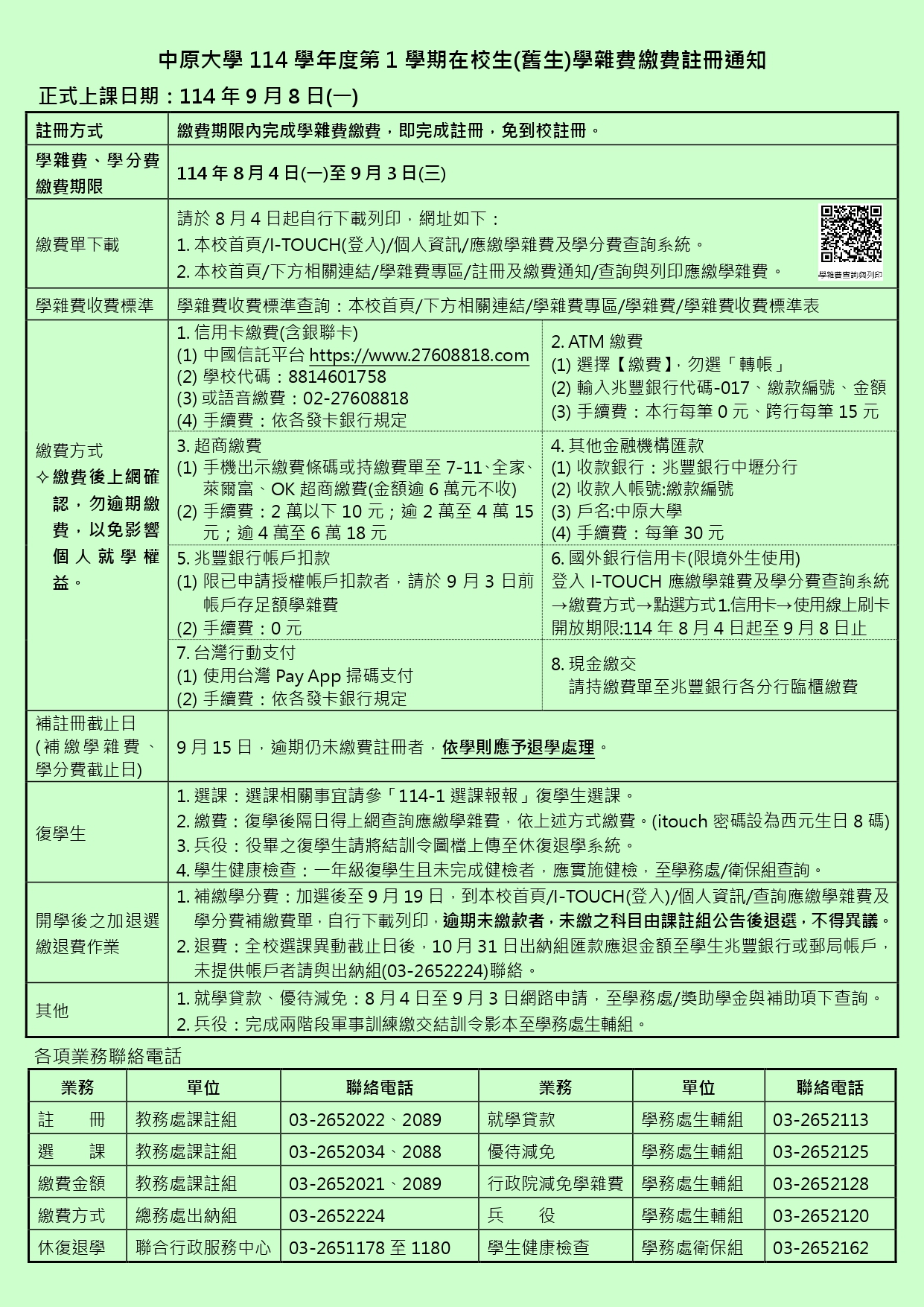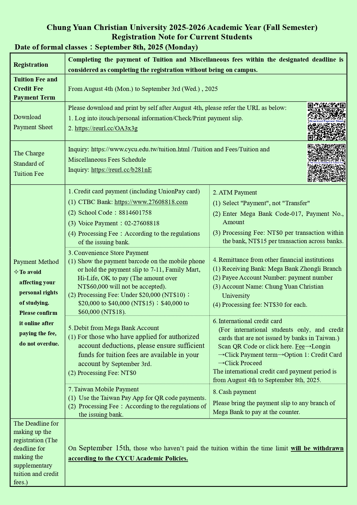 【114學年度第1學期在校生學雜費繳費註冊通知】【2025-2026 Academic Year (Fall Semester) Registration Note for Current Students】 2025-06-09 最新消息 / 系辦公告 https://ib.cycu.edu.tw/wp-content/uploads/114-1學期在校生學雜費繳費註冊通知-1.pdf https://ib.cycu.edu.tw/wp-content/uploads/114-1學期在校生學雜費繳費註冊通知_英文版-2.pdf You Might Also Like 轉知【114學年度志光林進榮慈善會-莘莘向榮獎助學金】 2025-09-22 【112學年度第2學期畢業證書領取及數位學位證書核發作業】 【112-2 semester CYCU Graduation Certificate Collection and Issuance for Digital Certificate of Degree】 2024-05-14 教育部青年發展署推動「青年百億海外圓夢基金計畫」 2025-11-26