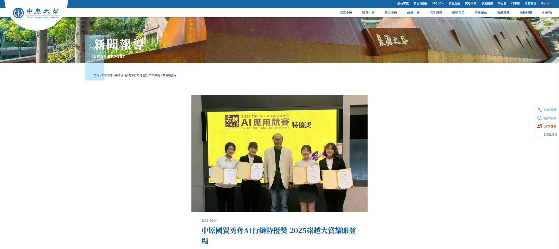 賀!陳宜棻老師、賴靖憲老師指導學生:李宜樺、李玟璇、張之俞、劉奕萱、鄭宇恩同學,參加「2025崇越行銷大賞」榮獲AI行銷影片創作組特優獎!校方官網同步祝賀! 2025-06-05 最新消息 / 榮耀與報導 本系師生於2025第十屆「崇越行銷大賞:AI應用競賽」勇奪佳績,日前已於本系網頁發布祝賀訊息。校方網站亦發布相關報導,特此轉載分享如下:https://www.cycu.edu.tw/?p=38032 讓我們再次一同恭喜獲獎團隊! You Might Also Like 113學年度第1學期中英文版本選課報報 2024-06-05 113學年度第1學期研究生「學位考試進度通知」、「中原大學碩博士論文撰寫格式規範」及「中原大學研究生離校注意事項」113-1 semester “Notice of Degree examination Schedule” , ” CYCU Guidelines about the Format of Thesis ” and ” CYCU Information about the Graduation Procedures for Postgraduate ” for Postgraduates 2024-10-18 國際處2023全球姊妹校博覽會 2023-10-24