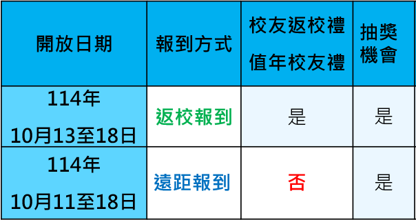 遠距線上報到可參加抽獎,共有70項大獎,如果不方便回娘家的校友也可以線上參與,歡迎多多宣傳!