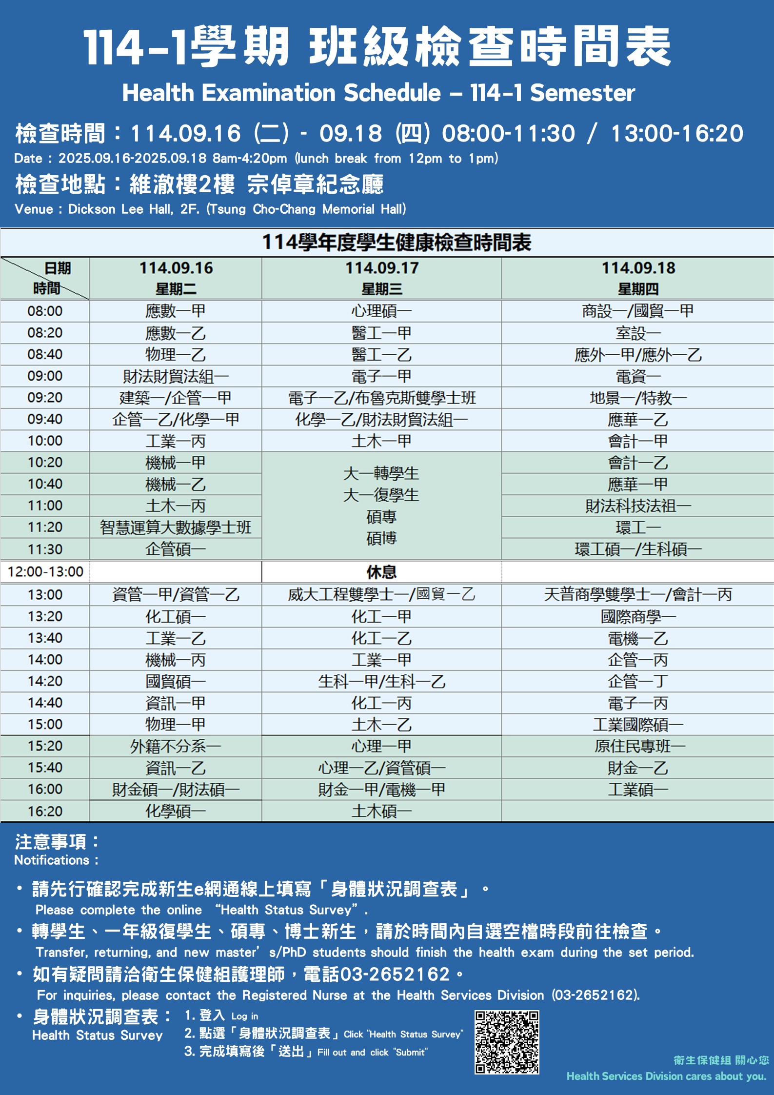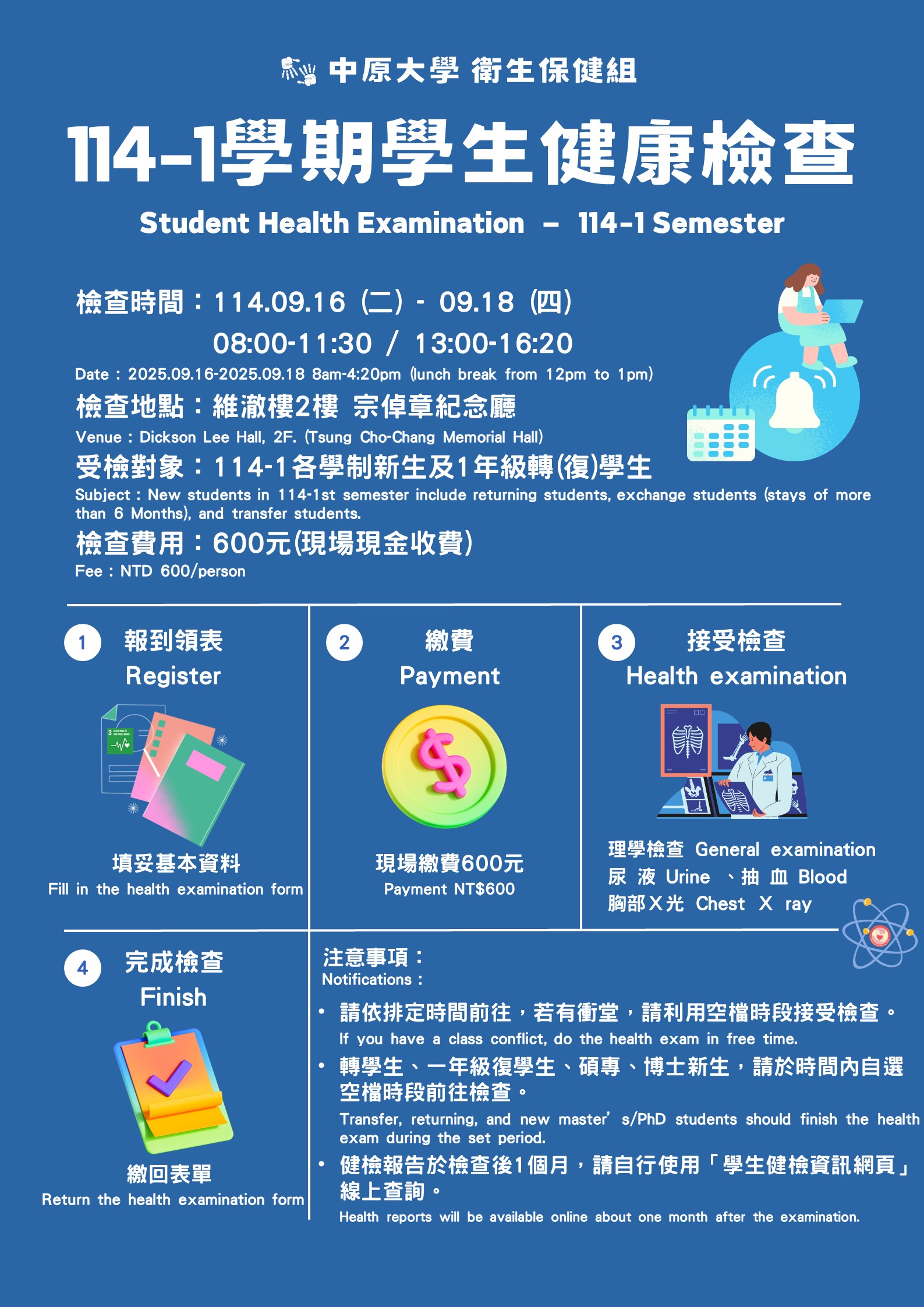 【衛生保健組-114學年度新生健康檢查通知】 2025-09-11 新生公告 / 最新消息 https://ib.cycu.edu.tw/wp-content/uploads/114學年度第一學期-學生健康檢查通知及注意事項中文版.pdf https://ib.cycu.edu.tw/wp-content/uploads/114-1-Notification-of-Student-Health-Examination.pdf You Might Also Like 113學年度天益獎助學金受理申請,即日起至113年10月13日止 2024-09-11 ※大三學生專屬活動※113年:大三UCAN共通職能測驗 2024-03-11 5/22、23 新創實習媒合會,歡迎同學踴躍參加! 2023-05-16