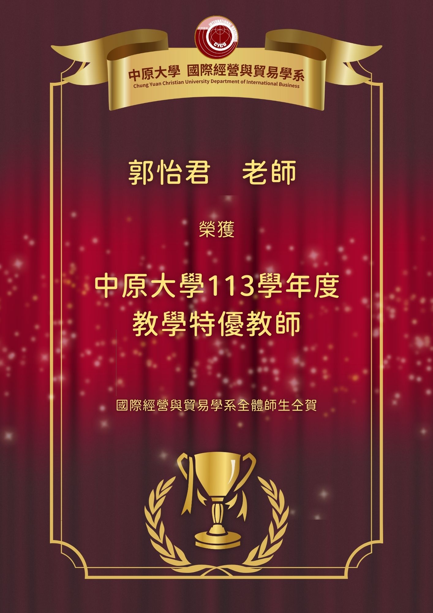 賀!郭怡君老師榮獲113 學年度特優教師 2025-09-12 最新消息 / 榮耀與報導 You Might Also Like 【轉知】2024.6.13(四)薪傳學院講座(通識認證),歡迎踴躍報名參加! 2024-06-06 113學年度自選學術導師相關事宜 2024-05-09 2023.03.16-氣候變遷與永續發展專題演講 2023-03-17