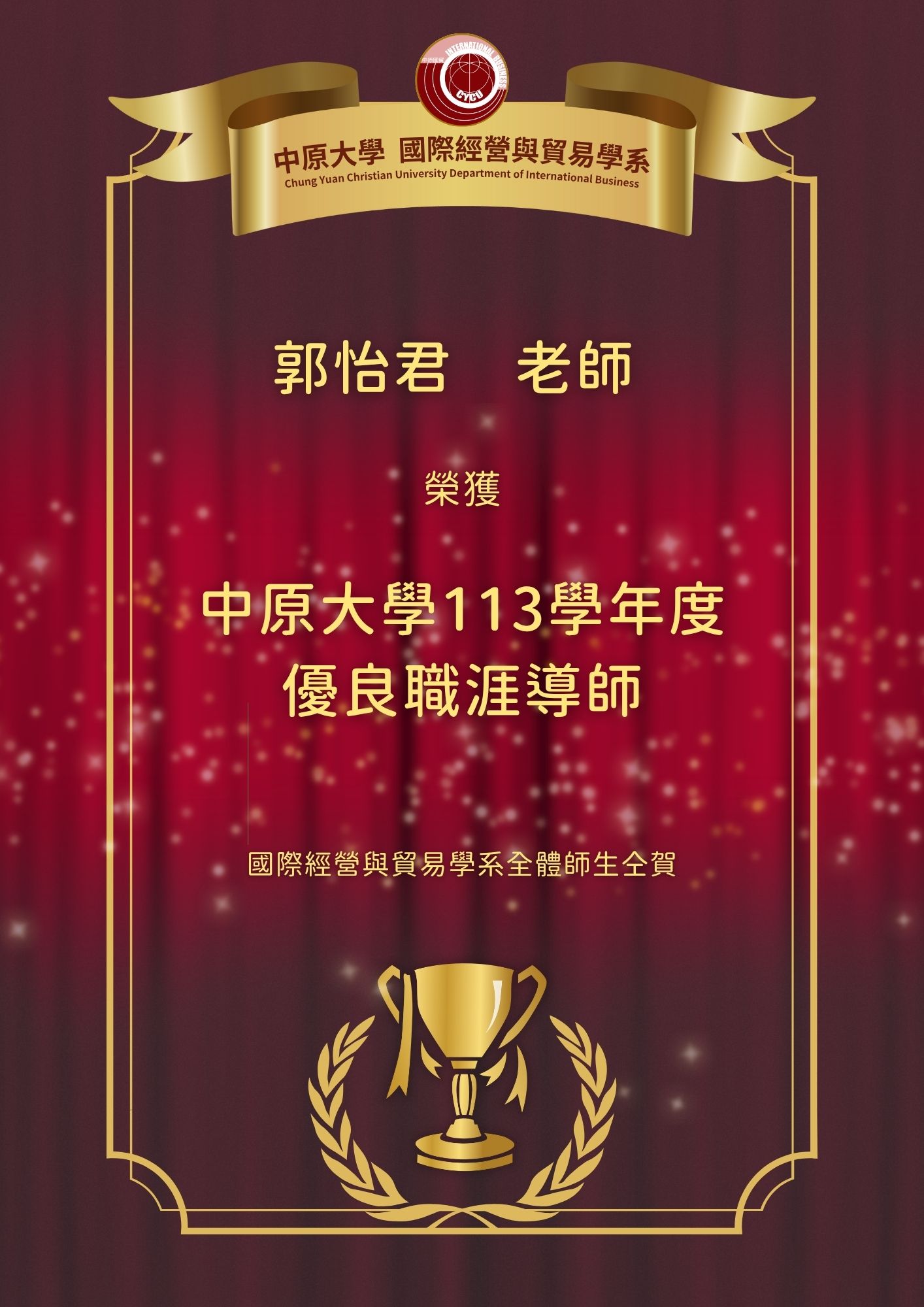 賀!郭怡君老師榮獲「113學年度優良職涯導師」 2025-10-23 最新消息 / 榮耀與報導 You Might Also Like 職訊轉po第四屆元大校園鑽金大使】 2025-09-15 112學年度優久聯盟國內交換生申請甄選作業事宜 2023-06-13 【獎金獵人】全人關懷獎|服務學習最高榮譽(徵件至5/1) 2023-03-24