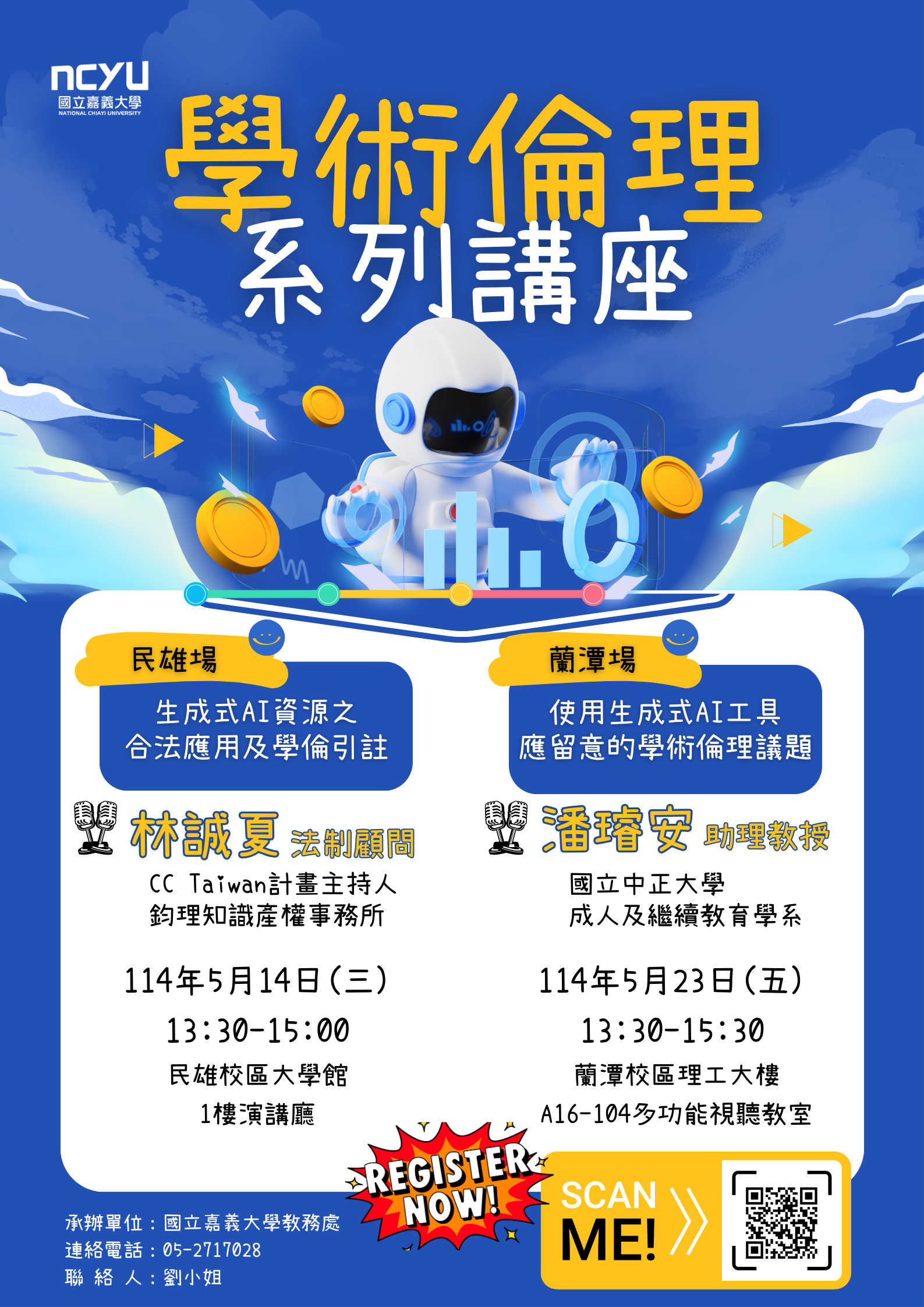 轉知【國立嘉義大學】學術倫理系列講座 2025-04-07 最新消息 / 活動資訊 You Might Also Like 【中原大學70 週年✨國貿系友回娘家✨】 2025-10-15 2024.04.10 專題演講 2024-04-11 敬邀出席第7屆BGS 授證典禮 2023-03-20
