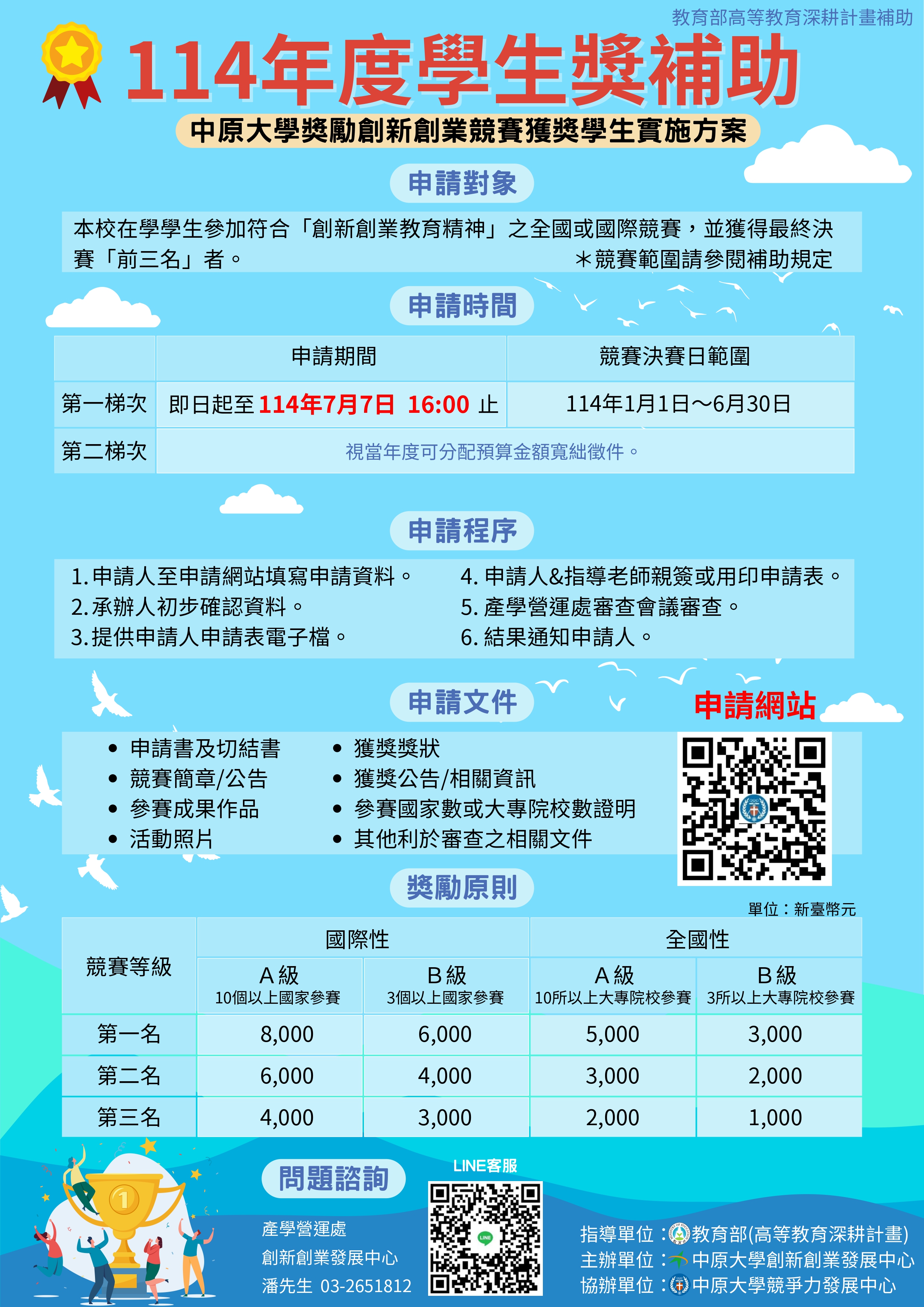轉知【114年度第1梯次學生創新創業競賽獲獎獎勵申請】 2025-04-10 最新消息 / 系辦公告 第一梯次申請期間:即日起至114年7月7日16時止競賽決賽日範圍:114年1月1日~6月30日申請程序:詳如附圖 You Might Also Like 113-1學期「導師輔導工作評量問卷」施測相關事宜 2024-12-19 2023.05.31-大專生畢業專題研究成果發表會 2023-06-06 【資訊轉發】Campus Program Summer 免費校園軟體實作培訓營 2023-04-28