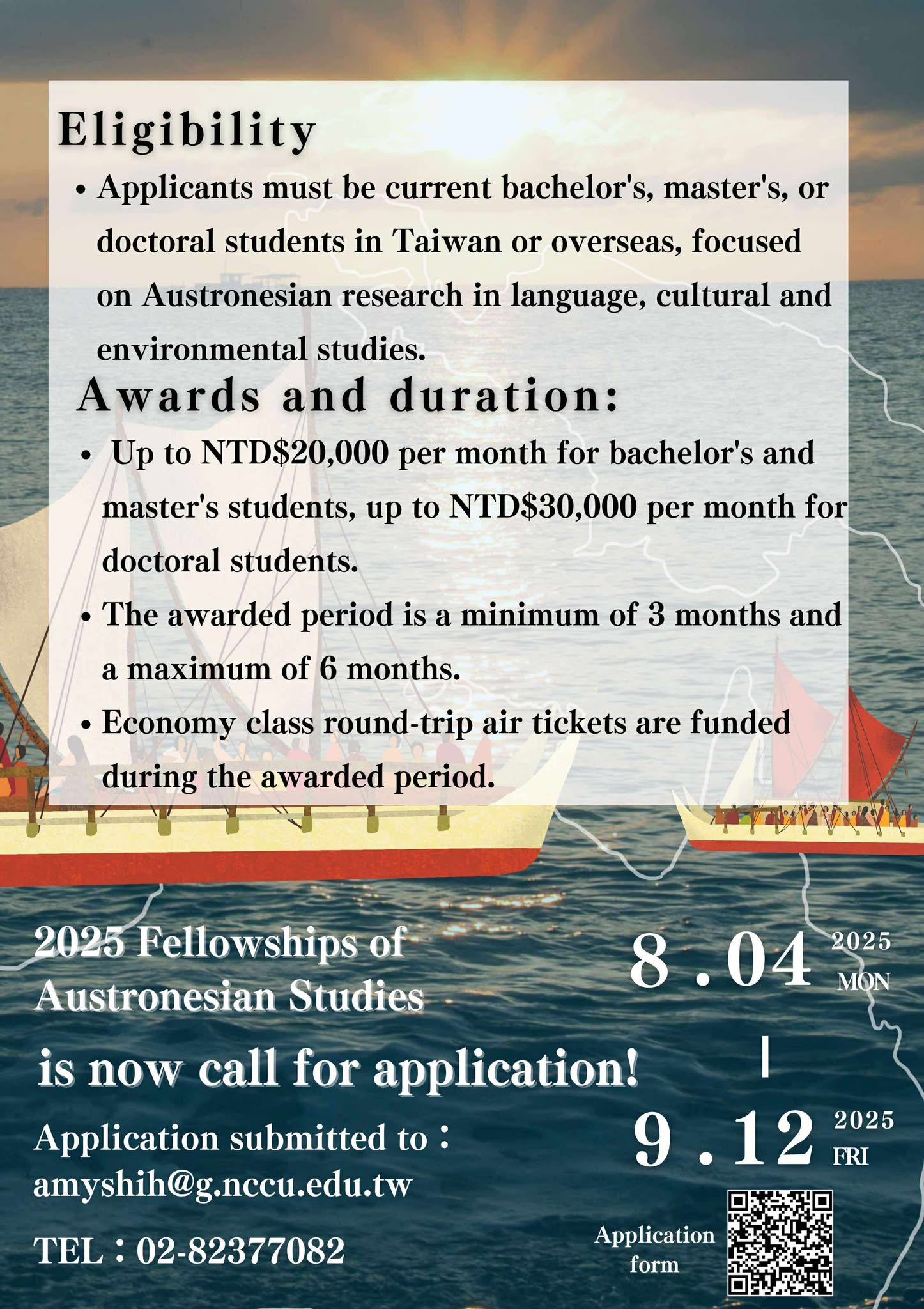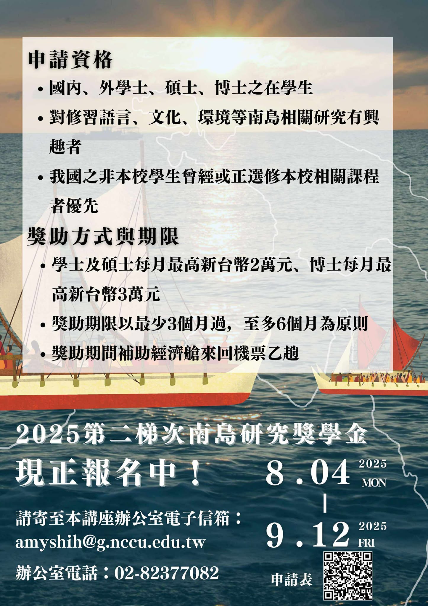 轉知【2025年第二梯次南島研究獎學金】 2025-08-11 最新消息 / 獎助學金 申請日期:114年8月4日(星期一) 至 114年9月12日(星期五) https://ib.cycu.edu.tw/wp-content/uploads/1140026008-0-2.pdf https://ib.cycu.edu.tw/wp-content/uploads/1140026008-0-3.pdf https://ib.cycu.edu.tw/wp-content/uploads/1140026008-0-4.pdf You Might Also Like 中原大學商學院全英語課程(EMI)修習獎勵要點 2024-01-15 錠嵂保險經紀人尖兵計畫,取得壽險證照就送iPad 2023-04-25 【諮商中心】111-2親密關係經驗探索工作坊活動資訊 2023-05-02