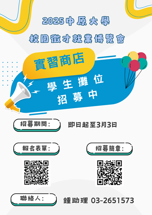 【轉知】職涯發展處-中原大學2025年校園徵才就業暨實習商店,歡迎有經驗的學生、社團組團提案,無相關經驗者亦歡迎參加~ 2025-02-24 最新消息 / 系辦公告 活動詳情請見中原i-touch行政公告:https://reurl.cc/b3vlWM You Might Also Like 「科技管理專業英語跨領域學程」招生說明會活動資訊 2023-04-20 【轉知】113-2 商學院英語課程(培力英檢)及英語自學課程(Voicetube/TOEIC) 2025-01-02 113學年度各學系轉系注意事項與錄取標準 2024-01-08