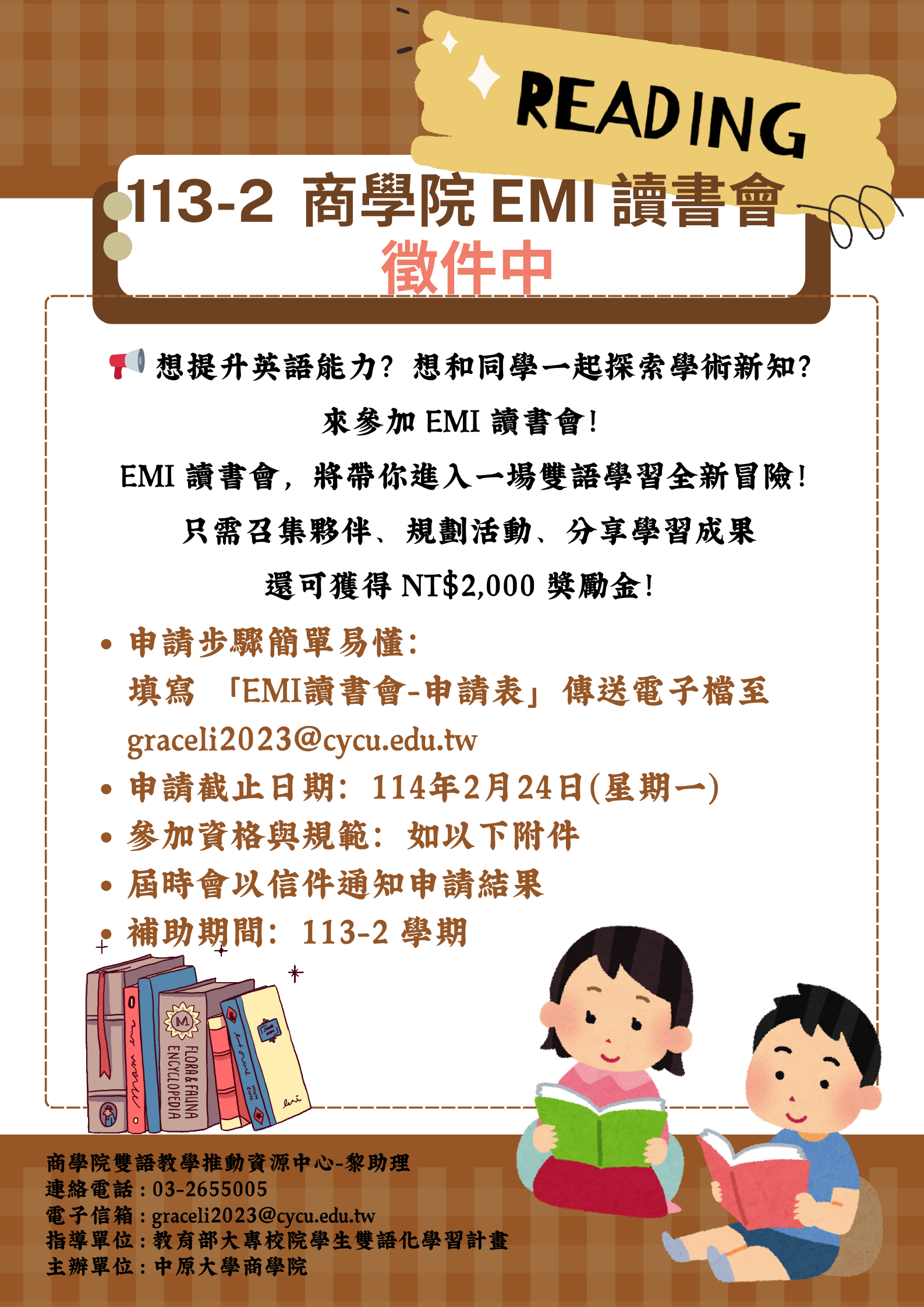 填寫 「EMI讀書會-申請表」,傳送電子檔至graceli2023@cycu.edu.tw。