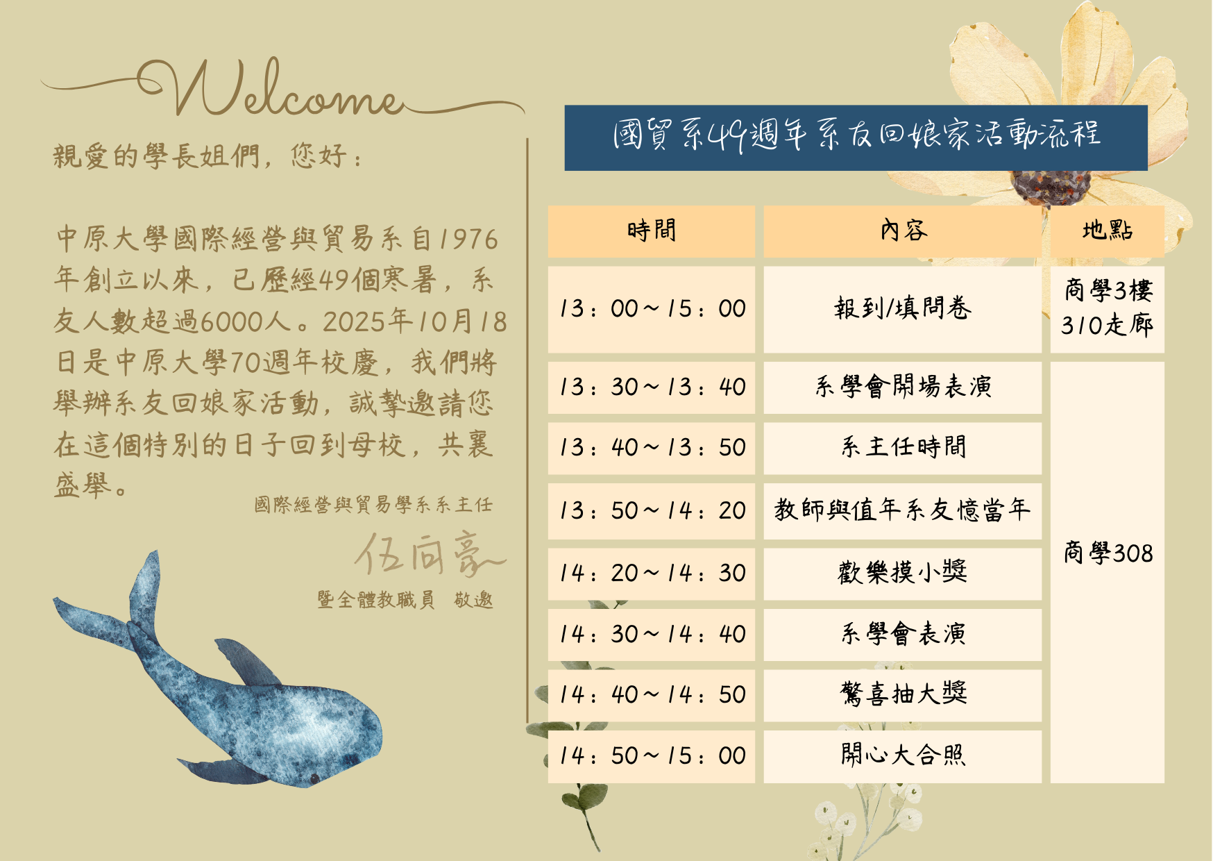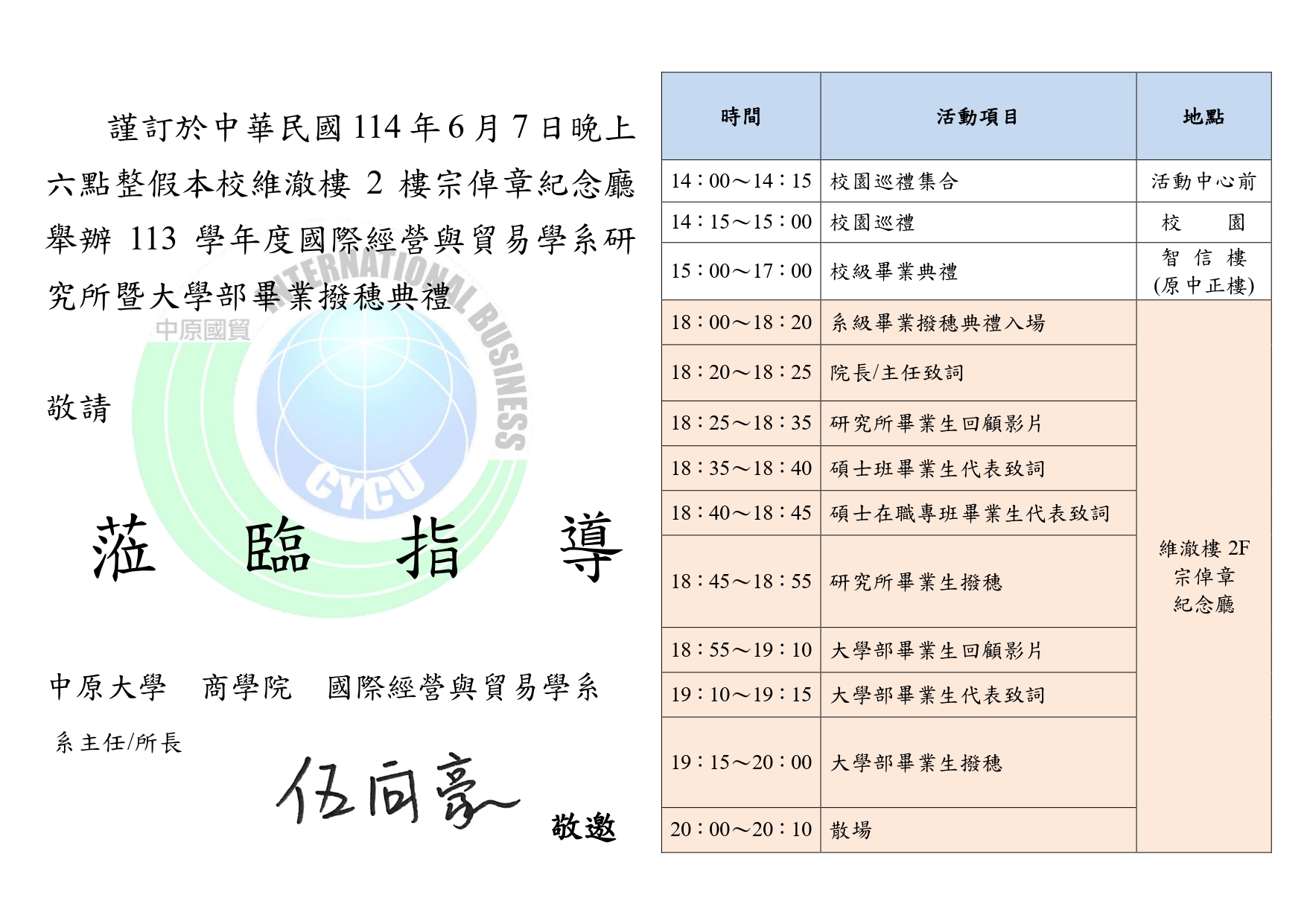 活動花絮 【中原大學70 週年✨國貿系友回娘家✨】 2025-10-15 【2025.10.18 中原大學70周年校慶暨校友日】,誠摯邀請國貿系友回娘家!!! 2025-09-24 【中原大學70週年】【49屆國際經營與貿易學系系友回娘家】 2025-09-15 【畢業典禮智信樓座位圖】 2025-06-04 【114學年度碩士、碩專班聯合迎新茶會】 2025-05-08 【113學年度國際經營與貿易學系研究所暨大學部畢業撥穗典禮 】 2025-04-15 2024.12.25 中原國貿所碩士論文計劃書發表會 2024-12-27 【轉知】國貿系生涯規劃課程專題演講 2024-12-11 113-1學期系主任導師時間 2024-12-04 2024.11.28「生涯規劃專題」課程講座 2024-12-02 2024.10.28「管理學」課程講座 2024-10-29 2024.10.19-中原國貿系48周年系友回娘家 2024-10-21 2024.06.15-112學年度國貿系大學部暨研究所畢業撥穗典禮 2024-06-18 2024.06.13「氣候變遷與永續發展」課程講座 2024-06-14 2024.05.29國貿財金所專題研討 2024-06-11 112學年度國際經營與貿易學系研究所暨大學部畢業撥穗典禮 2024-06-06 2024.06.01中原國貿系「重聚40」返校同學會 2024-06-04 113年06月01日(六)中原大學國貿系「重聚40同學會」,誠摯邀請畢業40週年學長姐回娘家! 2024-05-28 2024.05.22「專題研討」課程演講 2024-05-23 2024.5.16「國際觀光行銷」課程專題講座 2024-05-17 113學年度碩士、碩專班聯合迎新茶會 2024-05-10 2024.05.07企業參訪_大桐汽車股份有限公司 2024-05-09 112-2學期 企業參訪_森崴能源股份有限公司-彰化陸上風力發電廠 2024-05-03 2024.04.25 國際企業生產作業管理課程演講 2024-04-26 2024.04.10 專題演講 2024-04-11 2024.03.28 氣候變遷與永續發展專題演講 2024-03-29 112-2學期系主任導師時間 2024-03-13 2023.12.27 中原國貿所碩士論文計劃書發表會 2023-12-28 2023.11.21-歡迎印尼大學參觀訪問中原大學及國貿系! 2023-11-23 112-1學期系主任導師時間暨系友分享講座 2023-10-24 2023.06.07-碩士論文計劃書及專題成果發表會 2023-06-08 2023.06.03-111學年度國貿系大學部暨研究所畢業撥穗典禮 2023-06-07 2023.05.31-大專生畢業專題研究成果發表會 2023-06-06 2023.05.15-碩士/碩專班聯合迎新茶會 2023-05-16 2023.05.15-國際行銷管理專題演講 2023-05-15 2023.05.04-氣候變遷與永續發展專題演講 2023-05-10 2023.05.03-專題演講:蔡政哲 副總 2023-05-04 2023.05.02-市場開發與管理專題演講 2023-05-03 2023.04.24-國際行銷管理專題演講 2023-04-25 2023.04.10-國貿導論演講-陳俊吉資深經理 2023-04-12 2023.03.27-國貿導論演講-王嘉緯首席研究員 2023-04-12 2023.03.20-國貿導論演講-林建甫首席經濟學家 2023-04-12 2023.03.06-國貿導論演講-王成杰業務管理師 2023-04-12 2023.04.06-氣候變遷與永續發展專題演講 2023-04-07 市場開發與管理講座 2023-03-21 2023.03.16-氣候變遷與永續發展專題演講 2023-03-17 2023.01.04 碩士論文計劃書研討會 2023-01-04 企業參訪:Tutor ABC 2022-12-15 演講:台灣股市是王者歸來還是迴光返照?-卓益越寧 襄理 2022-12-08 111-1學期 系主任時間 2022-11-24 演講:轉動人生Gloria的陸海空-陳淑惠顧問 2022-11-07 生涯規劃專題:航空產業和你的選擇 2022-11-03 Taiwanese Industry Analysis and Stock Investment Strategy:蔡政哲副總 2022-03-24 2022論文計畫書研討會 2022-01-05 銀行關係跟不動產信託投資的財務決策:張元晨教授 2021-11-24 台灣產業與個股投資分析研究方法/基金經理人之生涯演講:蔡政哲副總經理 2020-04-15 2020碩士論文計畫書研討會 2020-01-08 Machine learning in FinTech:Prof. Huei-Wen Teng 2019-10-30 Trademark Protection and Bank Loan Contracting: The Evidence from the 1996 Federal Trademark Dilution Act:Prof. Chiu Wan-Chien 2019-10-09 公司評價 Corporate Valuation:Prof. Pekka Hietala 2019-10-08 Topic Gambling in the Loan Market Why Bank:Prof. Yen Ju- Fang 2019-10-07 全球群眾募資模式與前瞻思維:陳若暉教授 2019-05-15 Fintech 與區塊鏈概念及其應用:葉羅堯博士 2019-04-10 台灣產業與個股的投資分析與研究方法/ 證券研究人員職涯發展:蔡政哲副總經理 2019-03-06 The Dynamic Linkages between Stock and Foreign Exchange Markets: Evidence from China 2018-12-18 The Market Microstructure Effects of Bank Equity Holdings:Prof. Wei-Ling Song 2018-01-03 Board Networks and Corporate Innovation:張景宏教授 2017-11-22 The Impact of the Insider Share Pledging Regulation on Stock Trading and Firm Valuation:周冠男教授 2017-03-15 PUBLIC R&D SPENDING AND CROSS-SECTIONAL STOCK RETURNS:王衍智教授 2017-03-08 2017碩士論文計畫書發表會 2017-01-06 一帶一路:遠水救不了近火:侯維忠教授 2016-12-28 TEJ Event Study/Smart Wizard Functions:鍾宜秀講員 2016-12-14 跨國人力資源管理-非營利組織活動 2016-11-03 跨國人力資源管理-企業組 2016-10-27 Investor Sentiment and Price Discovery: Evidence from the Pricing Dynamics between the Futures and Spot Markets:周冠男教授 2016-05-25 第三方支付、非正式金融、Bank 3.0與金融監管:謝德宗教授 2016-05-18 FinTech 和大數據對學術與教育的挑戰:何宗武教授 2016-04-27 Grace Chen / Alan Wong (Thomson Reuters香港連線) 2016-03-25 Share Pledges and Margin Call Pressure:湛可南教授 2015-11-25 講座:斜槓青年創業之路選擇比努力更重要-薛楚頻博士候選人 2022-10-31 2023中原國貿系友回娘家 2023-10-24 2022中原國貿系友回娘家 2022-10-15 參訪:元碩國際股份有限公司 2022-10-03 講座:計畫趕不上變化-楊棋材董事 2022-09-19 2022國貿系大學部暨研究所畢業撥穗典禮 2022-06-15